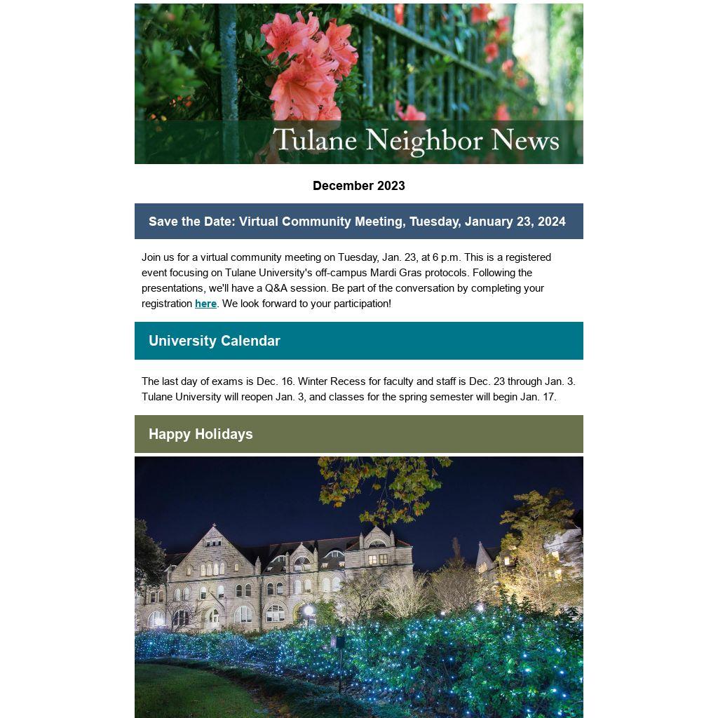Join us for a virtual community meeting on Tuesday, Jan. 23, at 6 p.m. This is a registered event focusing on Tulane University's off-campus Mardi Gras protocols. Following the presentations, we'll have a Q&A session. Be part of the conversation by completing your registration here. We look forward to your participation!