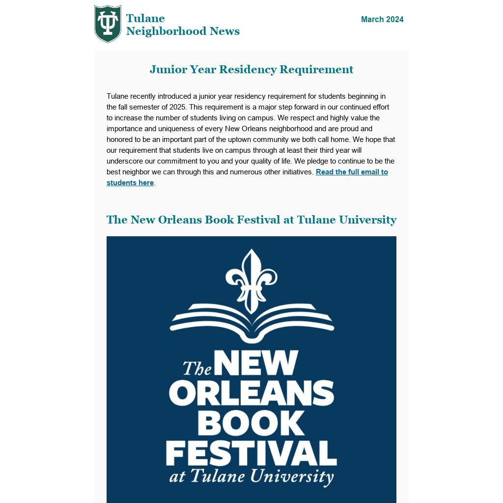 Tulane recently introduced a junior year residency requirement for students beginning in the fall semester of 2025. This requirement is a major step forward in our continued effort to increase the number of students living on campus. We respect and highly value the importance and uniqueness of every New Orleans neighborhood and are proud and honored to be an important part of the uptown community we both call home. We hope that our requirement that students live on campus through at least their third year will underscore our commitment to you and your quality of life. We pledge to continue to be the best neighbor we can through this and numerous other initiatives. Read the full email to students here.