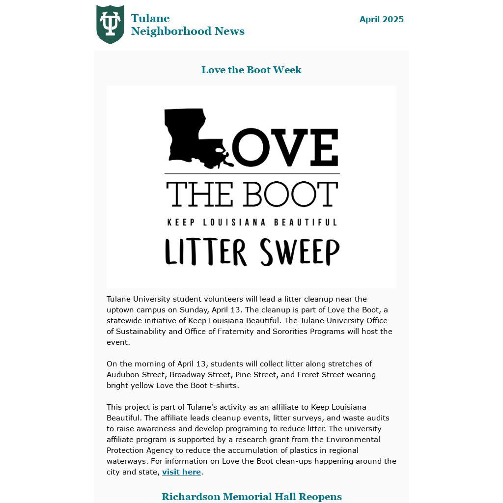 Tulane University student volunteers will lead a litter cleanup near the uptown campus on Sunday, April 13. The cleanup is part of Love the Boot, a statewide initiative of Keep Louisiana Beautiful. The Tulane University Office of Sustainability and Office of Fraternity and Sororities Programs will host the event.