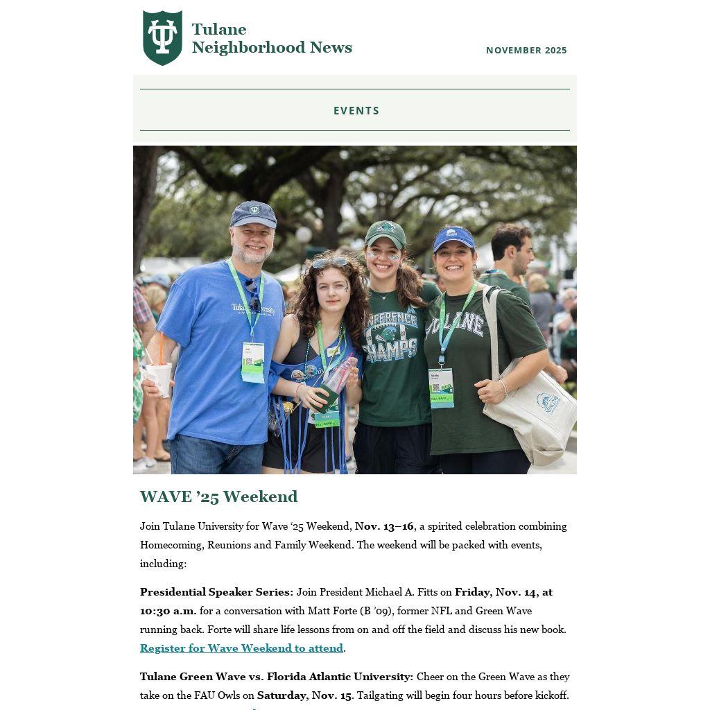 Join Tulane University for Wave ‘25 Weekend, Nov. 13–16, a spirited celebration combining Homecoming, Reunions and Family Weekend. The weekend will be packed with events, including: