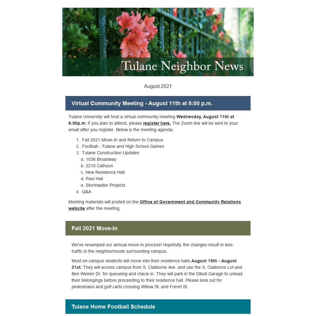 Most on-campus students will move into their residence halls August 15th - August 21st. They will access campus from S. Claiborne Ave. and use the S. Claiborne Lot and Ben Weiner Dr. for queueing and check-in. They will park in the Diboll Garage to unload their belongings before proceeding to their residence hall. Please look out for pedestrians and golf carts crossing Willow St. and Freret St.