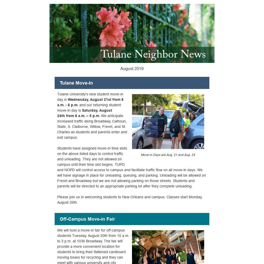 Students have assigned move-in time slots on the above listed days to control traffic and unloading. They are not allowed on campus until their time slot begins. TUPD and NOPD will control access to campus and facilitate traffic flow on all move-in days. We will have signage in place for unloading, queuing, and parking. Unloading will be allowed on Freret and Broadway but we are not allowing parking on those streets. Students and parents will be directed to an appropriate parking lot after they complete unloading.