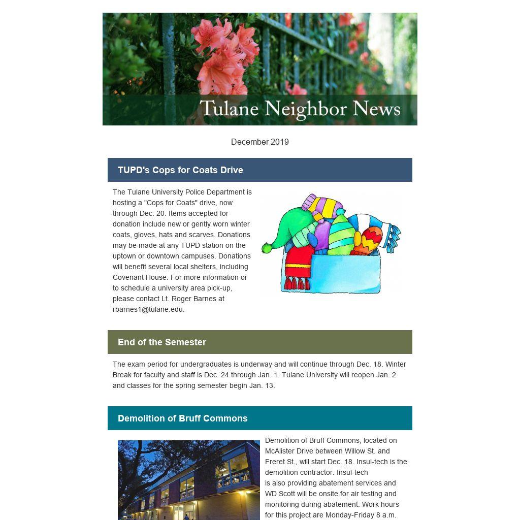 The Tulane University Police Department is hosting a "Cops for Coats" drive, now through Dec. 20. Items accepted for donation include new or gently worn winter coats, gloves, hats and scarves. Donations may be made at any TUPD station on the uptown or downtown campuses. Donations will benefit several local shelters, including Covenant House. For more information or to schedule a university area pick-up, please contact Lt. Roger Barnes at rbarnes1@tulane.edu.