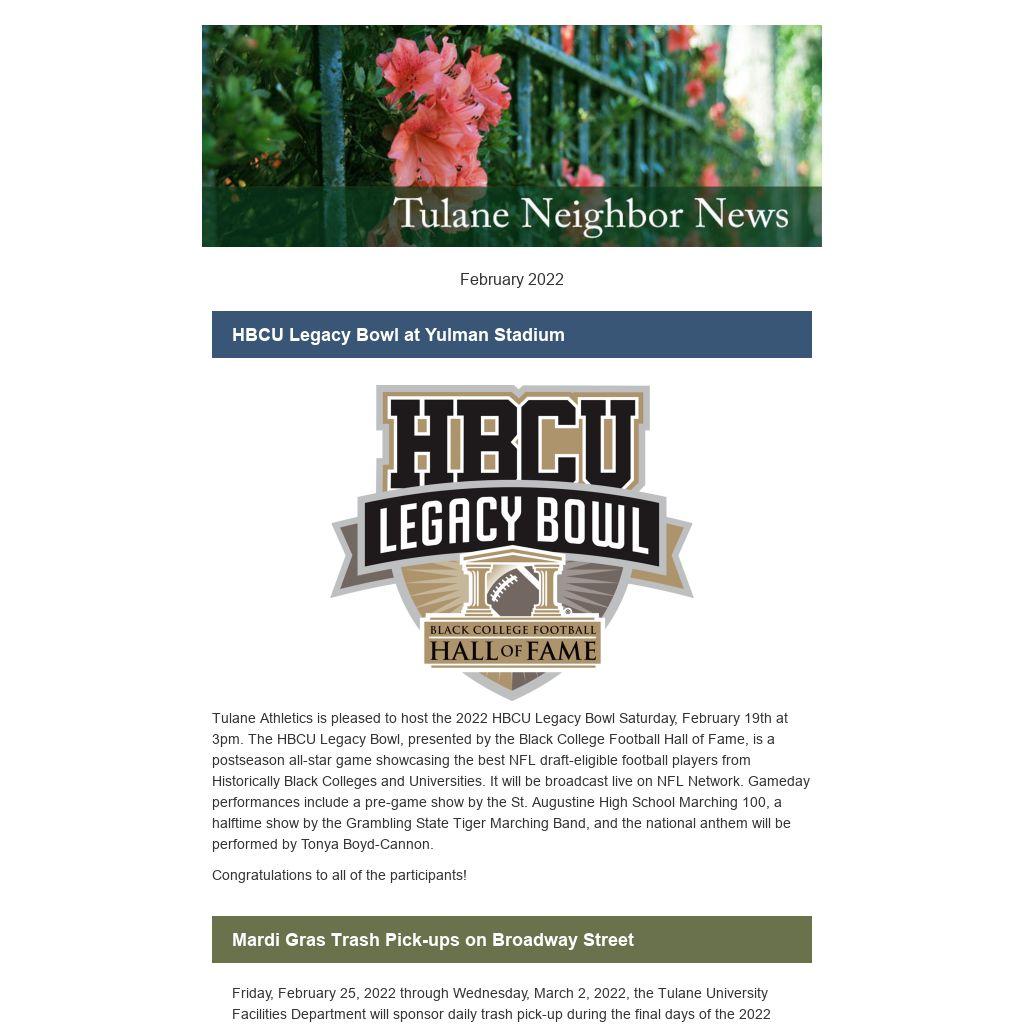 Tulane Athletics is pleased to host the 2022 HBCU Legacy Bowl Saturday, February 19th at 3pm. The HBCU Legacy Bowl, presented by the Black College Football Hall of Fame, is a postseason all-star game showcasing the best NFL draft-eligible football players from Historically Black Colleges and Universities. It will be broadcast live on NFL Network. Gameday performances include a pre-game show by the St. Augustine High School Marching 100, a halftime show by the Grambling State Tiger Marching Band, and the national anthem will be performed by Tonya Boyd-Cannon.