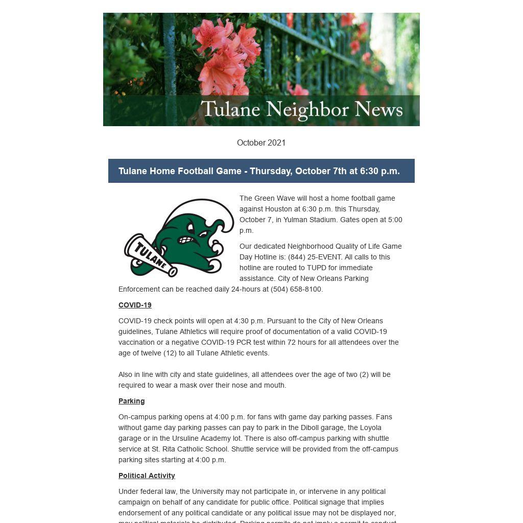 The Green Wave will host a home football game against Houston at 6:30 p.m. this Thursday, October 7, in Yulman Stadium. Gates open at 5:00 p.m.